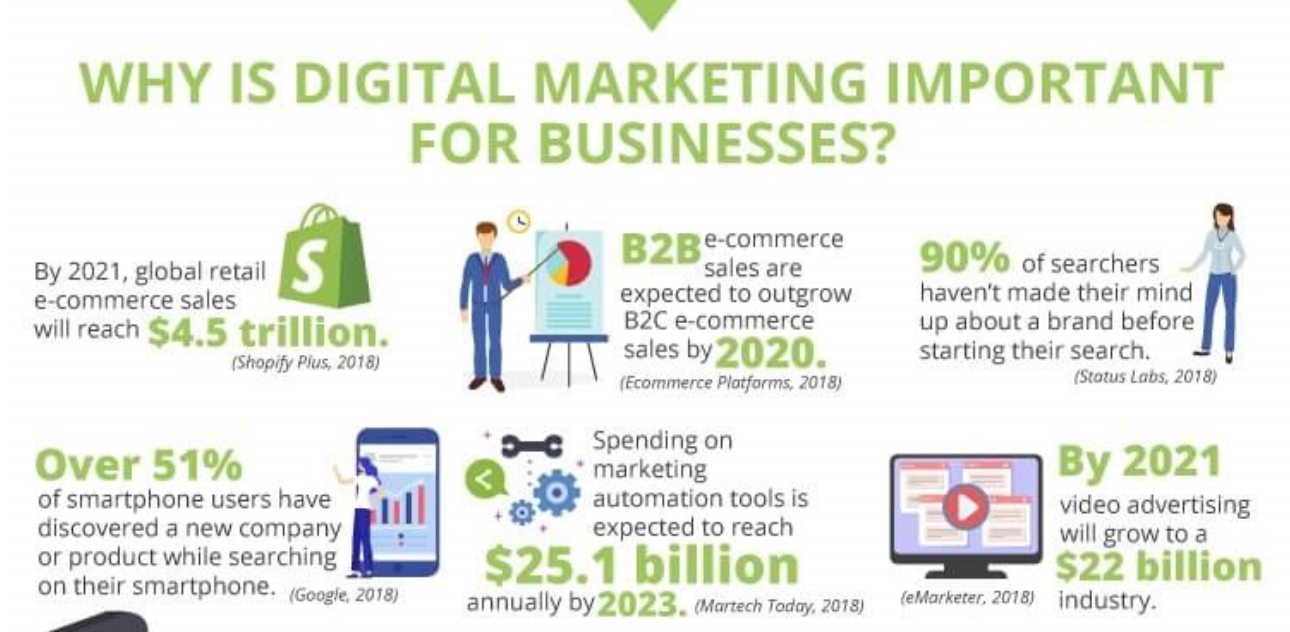 Andrew Hutchinson just recently published “Why is Digital Marketing Important for Business in 2019?” on April 7, 2019 in SocialMediaToday using infographics, which will also be shown. Digital marketing is a significant part of any modern day business approach. The article contains 100 data points that highlight just how important it is for business to utilize digital marketing. It states that business can use digital channels as leverage including email, search engines, websites, and social media in order to connect with current and prospective customers. In Figure 1, Hutchinson shows statistics that prove just how impactful digital marketing can be. I found it interesting that more than 51% of people using smartphones have found products first by using their phone. In the next two years, video advertising will grow into a $22 billion industry, and global retail e-commerce sales will make more than $4.5 trillion.
